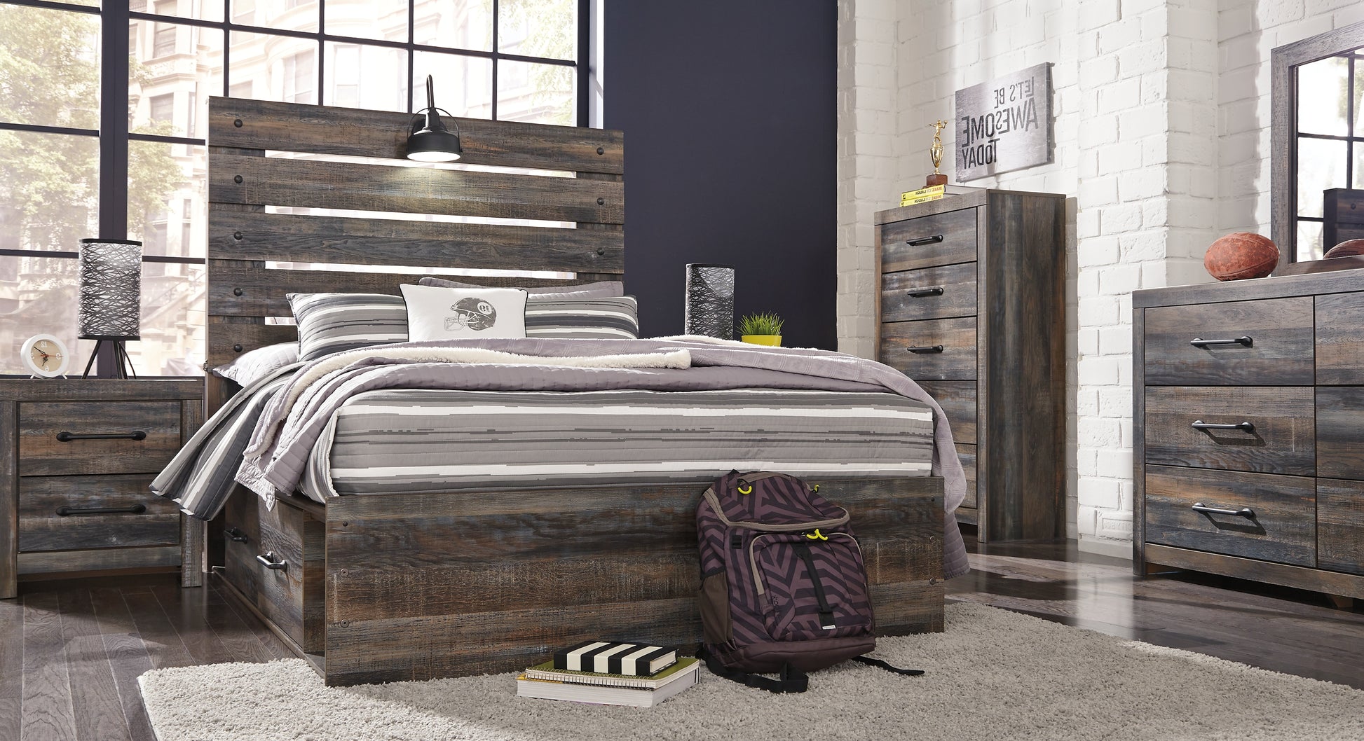 When merged in just the right way, rustic and industrial styles can make one happy marriage. Case in point: this queen panel bed with storage. A refined take on barn board beauty, its complex, replicated wood grain showcases hints of burnt orange and teal tones for a sense of weatherworn authenticity. Love to read in bed? You’re sure to find the pair of retro-chic light sconces and USB plug-ins on the open-slat style headboard such a bright idea. Underneath the bed: smooth-gliding drawers and open cubbies that accommodate casually cool storage bins.