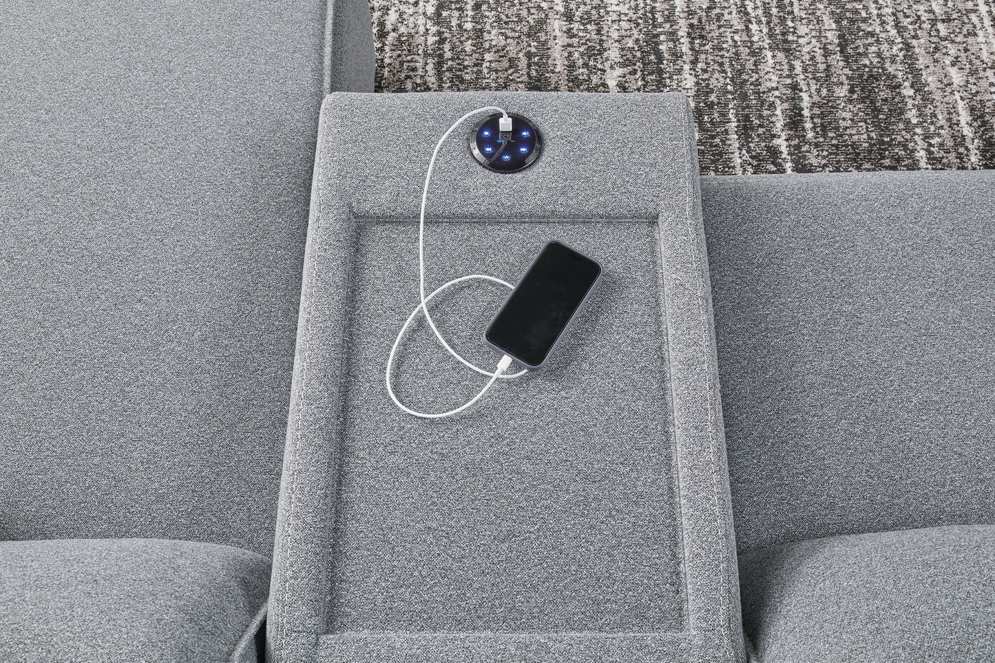 | Details | Includes 7 modular pieces: left-arm facing power recliner, power armless recliner, armless chair, 2 consoles with audio systems, wedge and right-arm facing power recliner, "Left-arm" and "right-arm" describe the position of the arm when you face the piece, Versatile modular pieces fit together in a variety of configurations, One-touch power control with adjustable positions, Easy View™ adjustable headrest and zero-draw USB port, Zero-draw technology only consumes power when the USB receptacle is in use, Corner-blocked frame with metal reinforced seat, Attached seat and back cushions; high-quality foam cushions wrapped in poly fiber, Polyester upholstery; Next-Gen Nuvella™ is a family-friendly fabric that is soft, easy to clean, stain-resistant and durable, Clean fabric with mild soap and water, let air dry; for stubborn stains, use a solution of 4 oz. bleach to 28 oz. water, Throw pillows with easy-to-remove zippered covers for machine washing; pillows with soft polyfill, Console with plexiglass top; built-in audio sound system with wireless connectivity; audio controls located on console; USB charging, Zero wall recliner design requires minimal space between wall and chair back, Power cord included; UL Listed | |